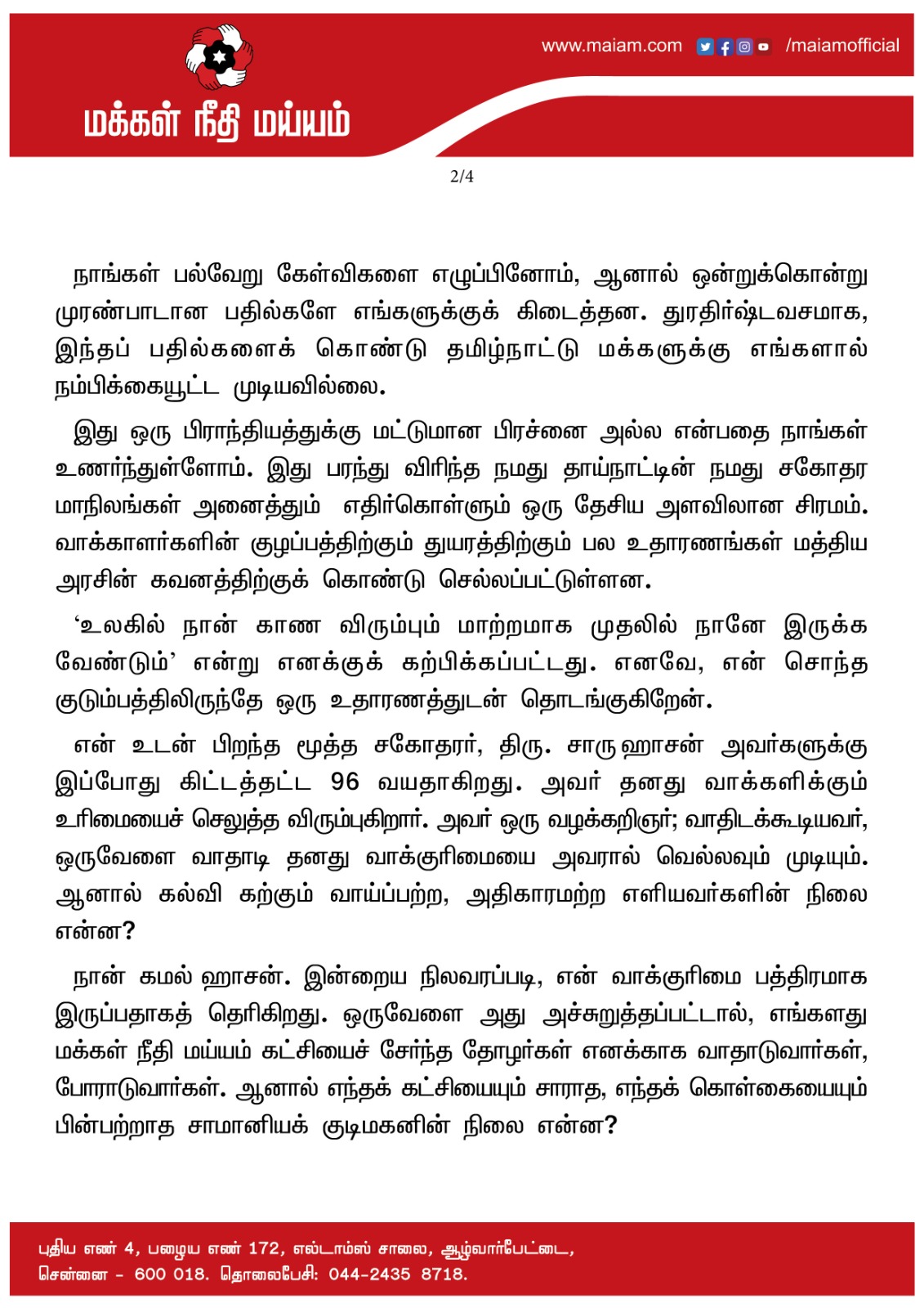 மக்கள் நீதி மய்யம் தலைவர், நாடாளுமன்ற மாநிலங்களவை உறுப்பினர் திரு. கமல் ஹாசன் அவர்கள் நாடாளுமன்ற அவைத் தலைவர்களின் கூட்டத்தில் ஆற்றிய உரையின் தமிழாக்கம்: