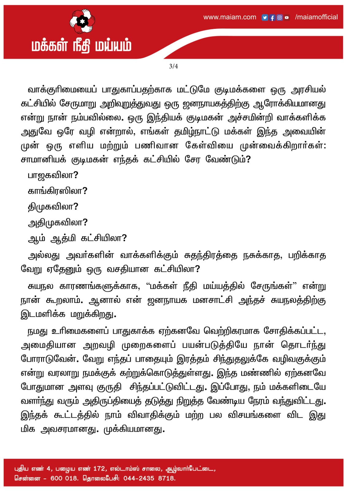 சுயநல காரணங்களுக்காக, "மக்கள் நீதி மய்யத்தில் சேருங்கள்" என்று நான் கூறலாம். ஆனால் என் ஜனநாயக மனசாட்சி அந்தச் சுயநலத்திற்கு இடமளிக்க மறுக்கிறது.